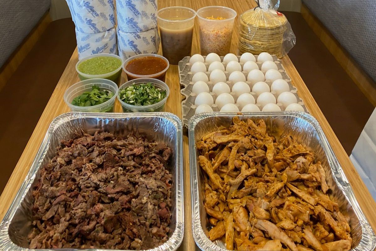 roasted chicken, five pounds of carne asada, a pint of red salsa, a pint of